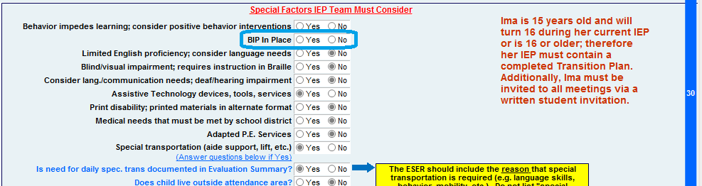 A new field has been added to it IEP Info in the special education database. When completing an IEP, you will find in the “Special Factors IEP Team Must Consider” a new Yes-No box labeled “BIP in Place”