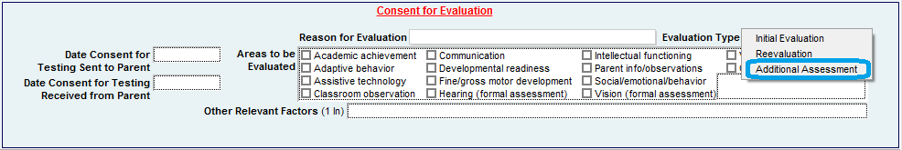 While an “Other” option has been added to the reason for evaluation, it has been removed from the “Evaluation Type” field and replaced with “Additional Assessment”. Choose this option when obtaining consent for additional assessment of the student.