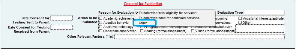 An “Other” field has been added under the dropdown list for “Reason for Evaluation”  This can be used in the event that additional assessment is required as part of anything other than initial eligibility or continued services, such as an FBA or BIP.NewOtherField