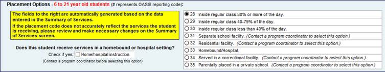 The student’s “Placement Code” on the LRE screen will now be automatically generated based on the data that is entered in the Summary of Services.  In most cases, all you will need to do is review the placement code to ensure that it is correct.