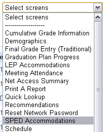 Testing accommodations for special ed students are now available in PowerTeacher for all teachers (gen ed and sped) to view. Access the Accommodations screen by using the “Select Screen” drop-down menu. You will be able to view this page for any student who is enrolled in one or more class that you teach.