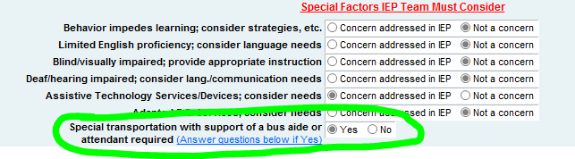 We’ve made a small change to the language in the special ed database in regards to documenting the need for special transportation. The text now reads “Special transportation with support of a bus aide or attendant required.” This is to comply with a change in state legislation that requires us to document in the IEP if a student needs an aide on the special education bus. Because all of our sped busses have at least one aide on board, we have opted to add this language to the IEP of every student that requires special ed transportation.